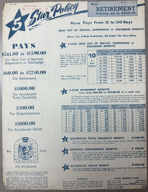 LECMPA was established in 1910 as a cooperative assessment insurer. Our first policyholders were Locomotive Engineers, Conductors and Streetcar Motormen, who pledged to financially protect each other from the perils inherit in their hazardous occupations.